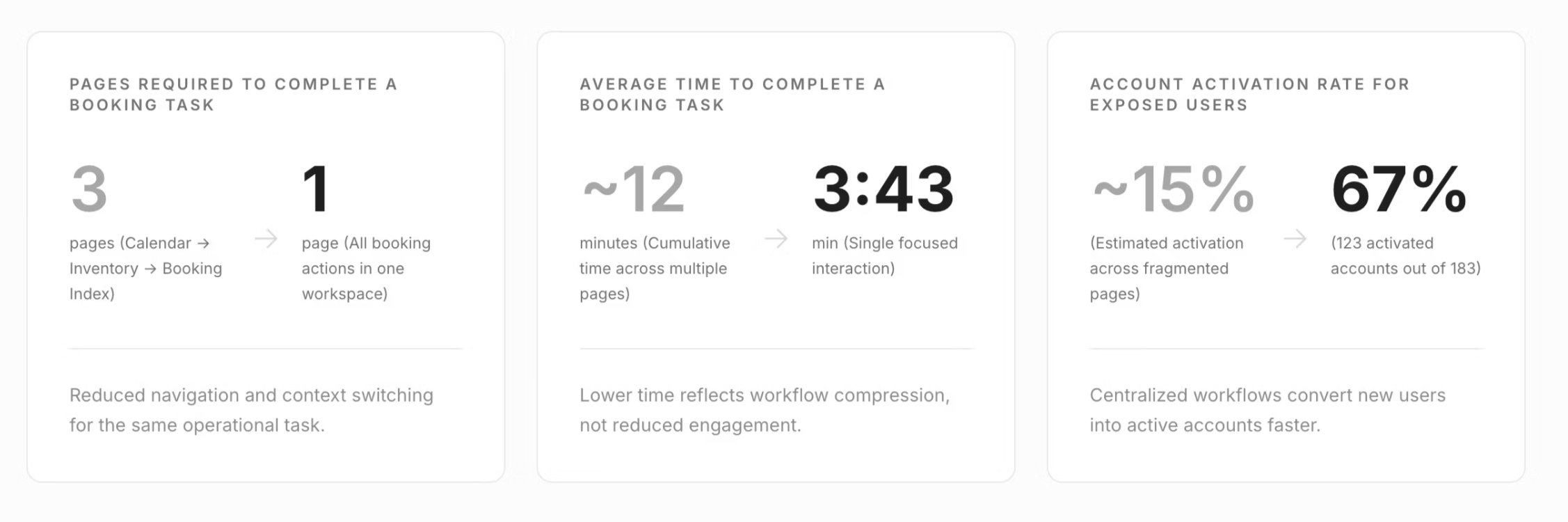 Three platforms meant three different ways to modify bookings, check in guests, and process payments. Operators spent 12 minutes on tasks that should take 3, clicking through 5-8 screens while losing context.