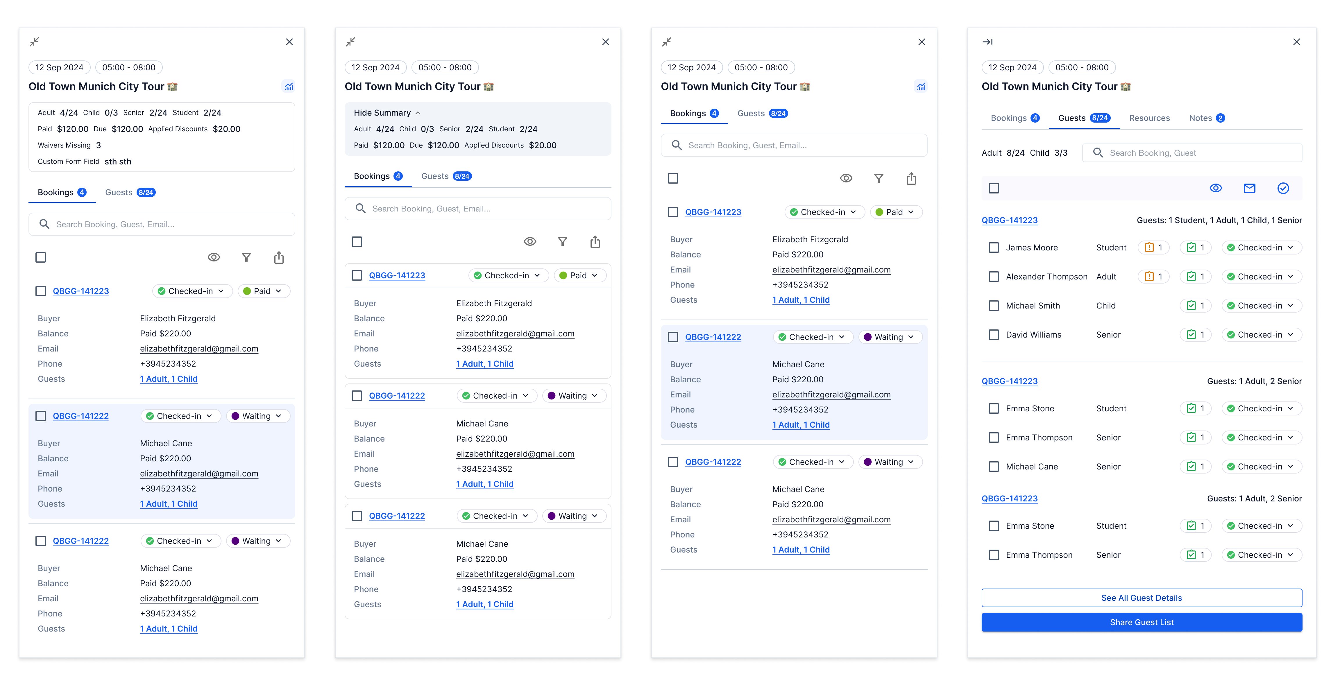 Operators needed to modify bookings, check in guests, and process payments without losing their place in the calendar. I designed an adaptable drawer—universal information at the top (status, details), contextual information below (capacity, group size, customer history), actions always accessible.