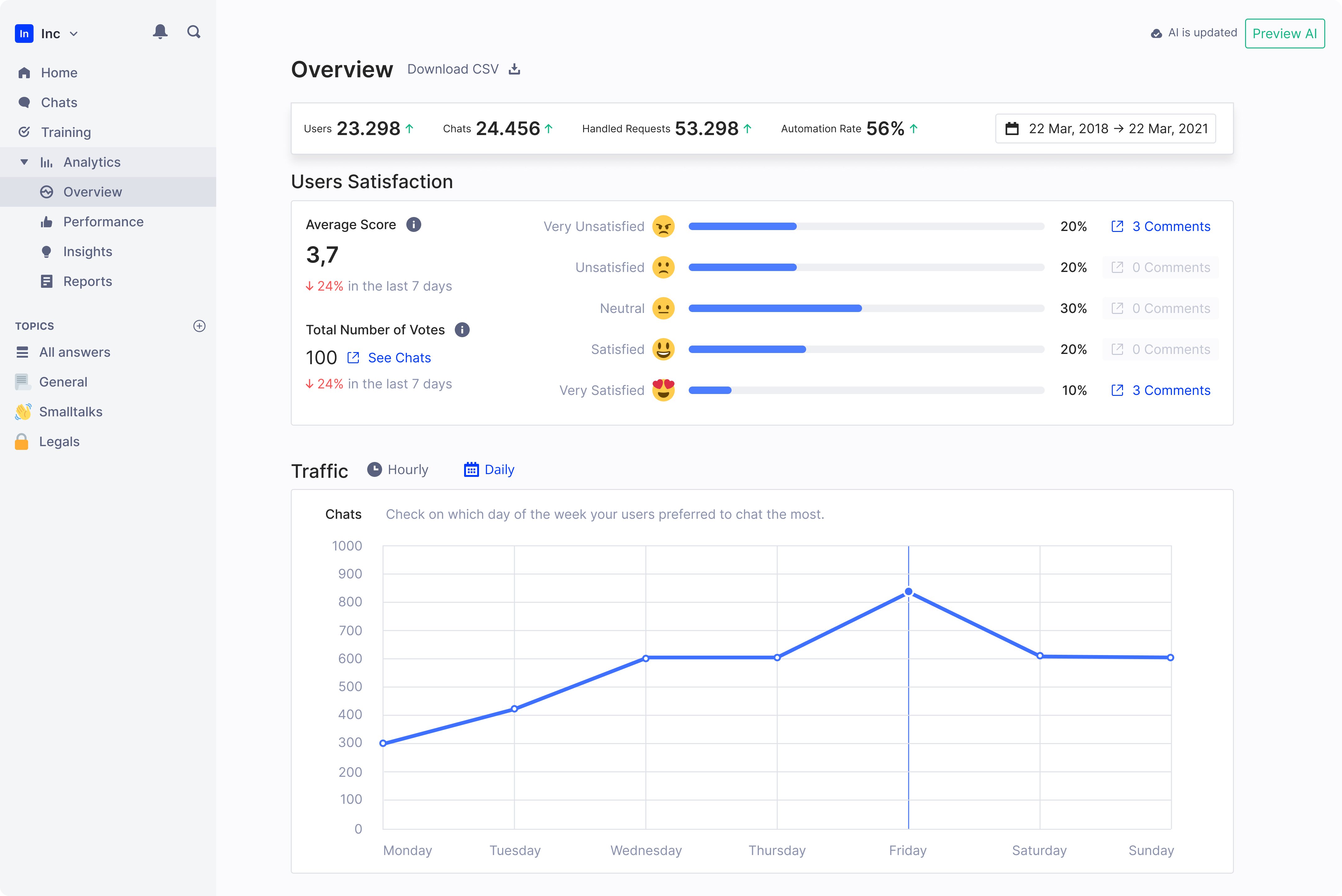 Connected analytics to action. Unanswered questions linked to Training Center. Top conversations linked to Chat History.