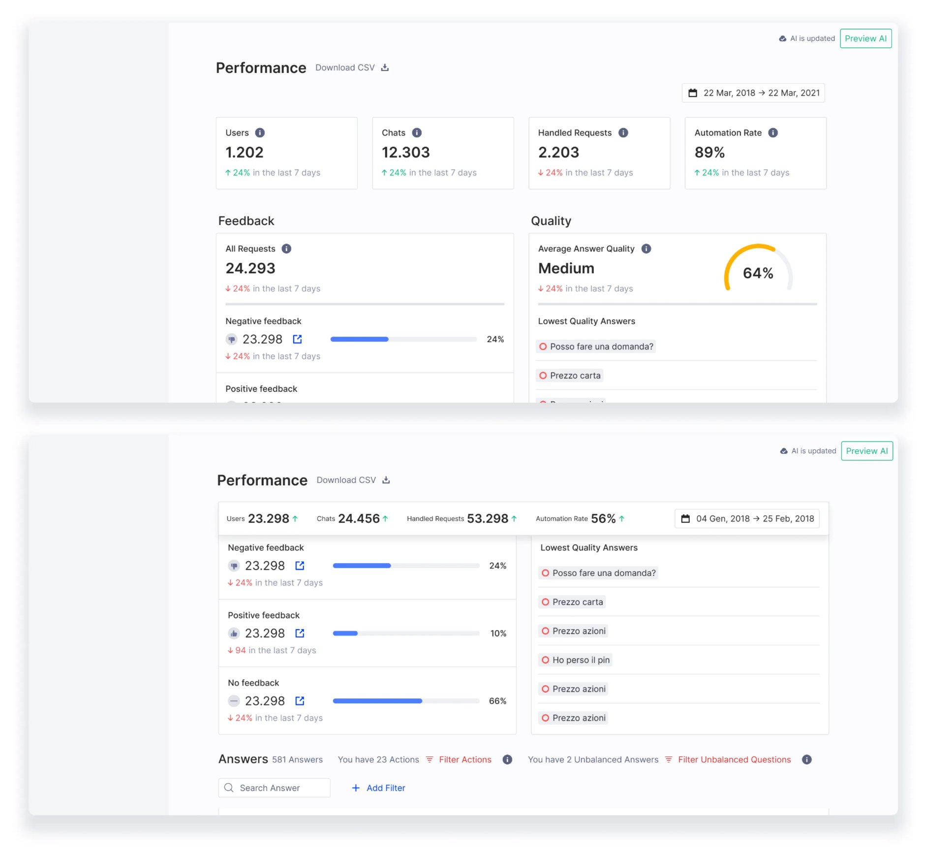 AI Knowledge Base Score introduced—After discussions with AI researchers, we added a comprehensive performance metric. Single number (0-100) representing overall assistant quality.