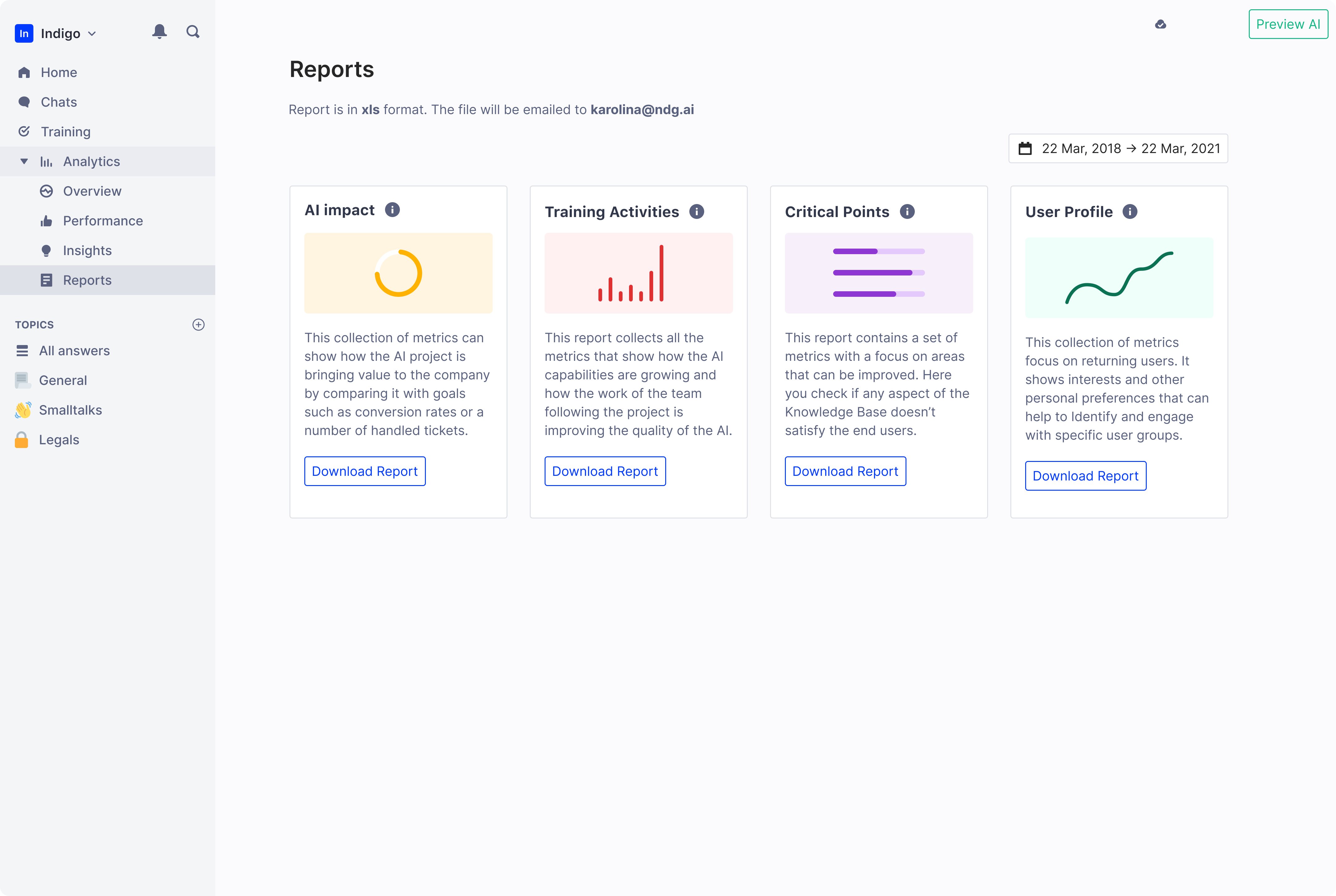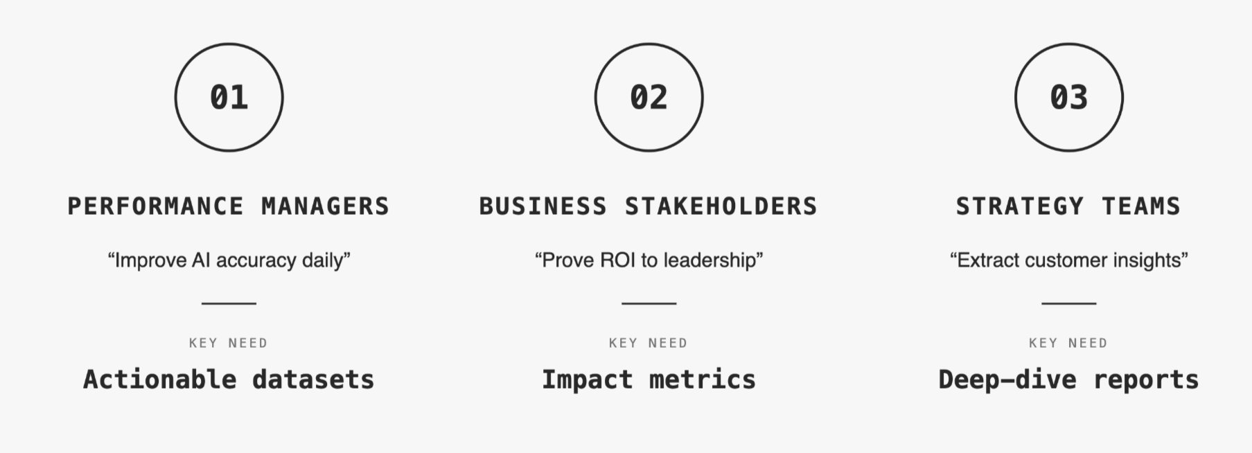 Beyond that, priorities diverged. Performance managers needed unanswered questions linked to Training Center. Business stakeholders needed ROI calculations for reports. Strategy teams needed export flexibility and historical comparison.