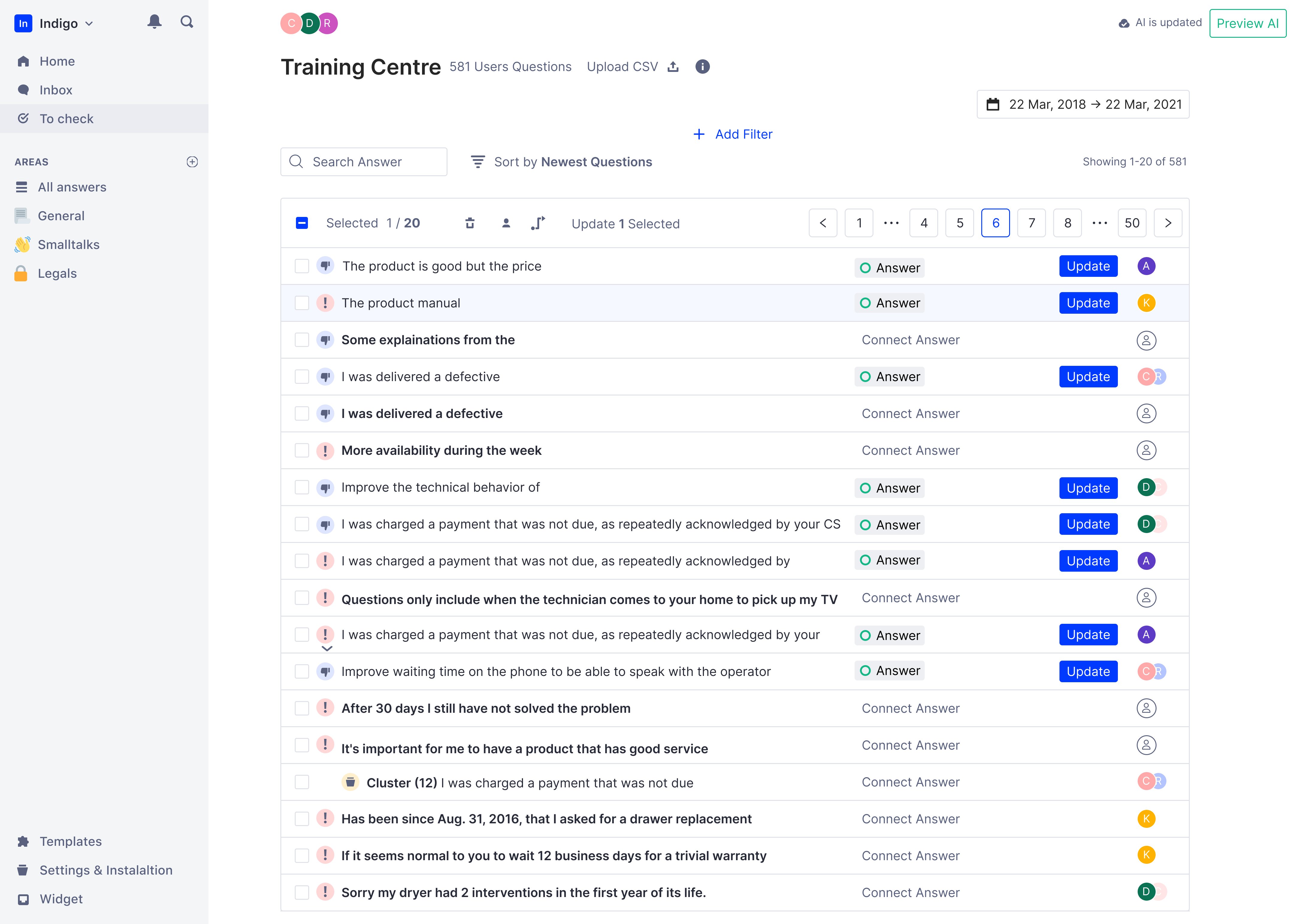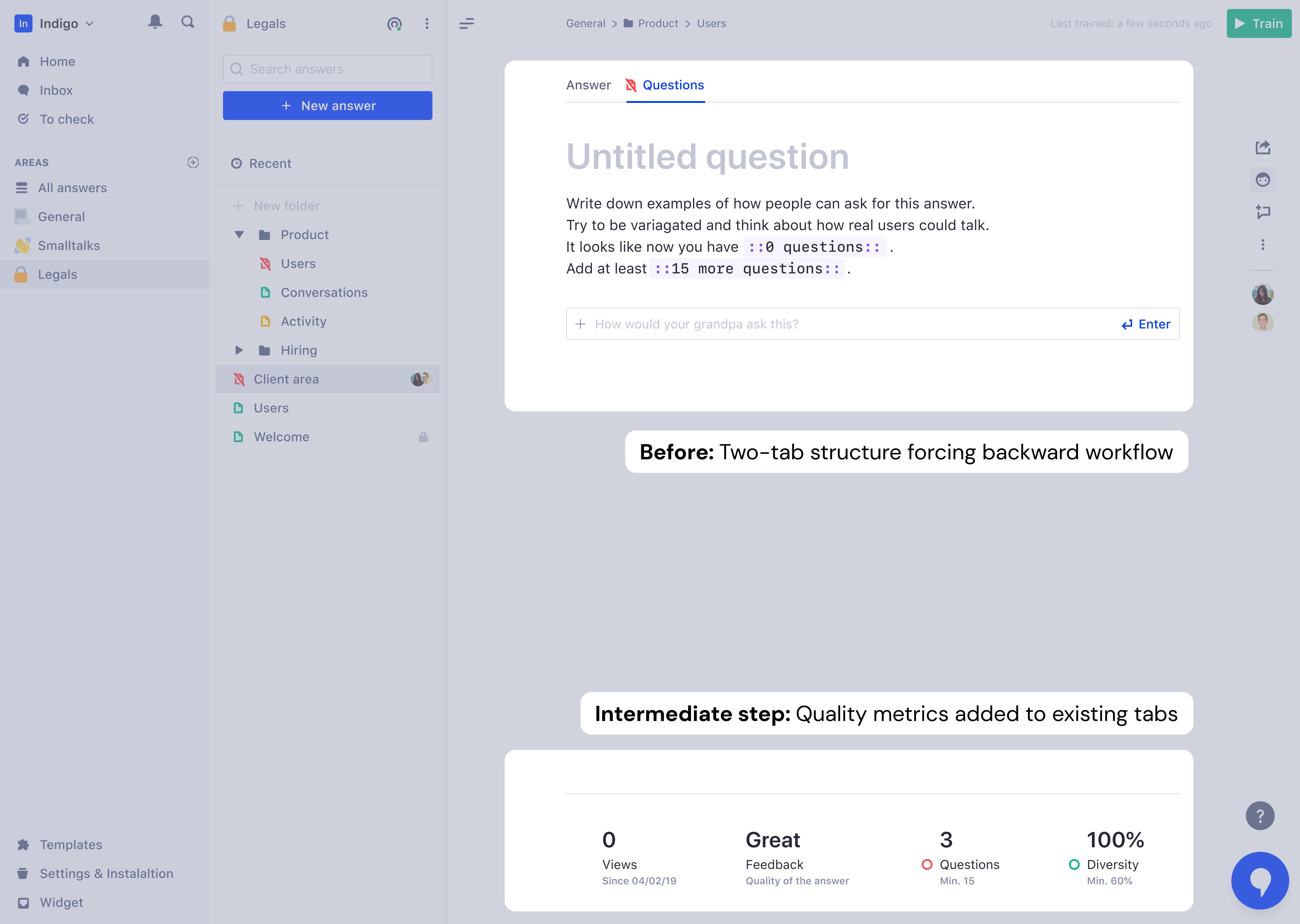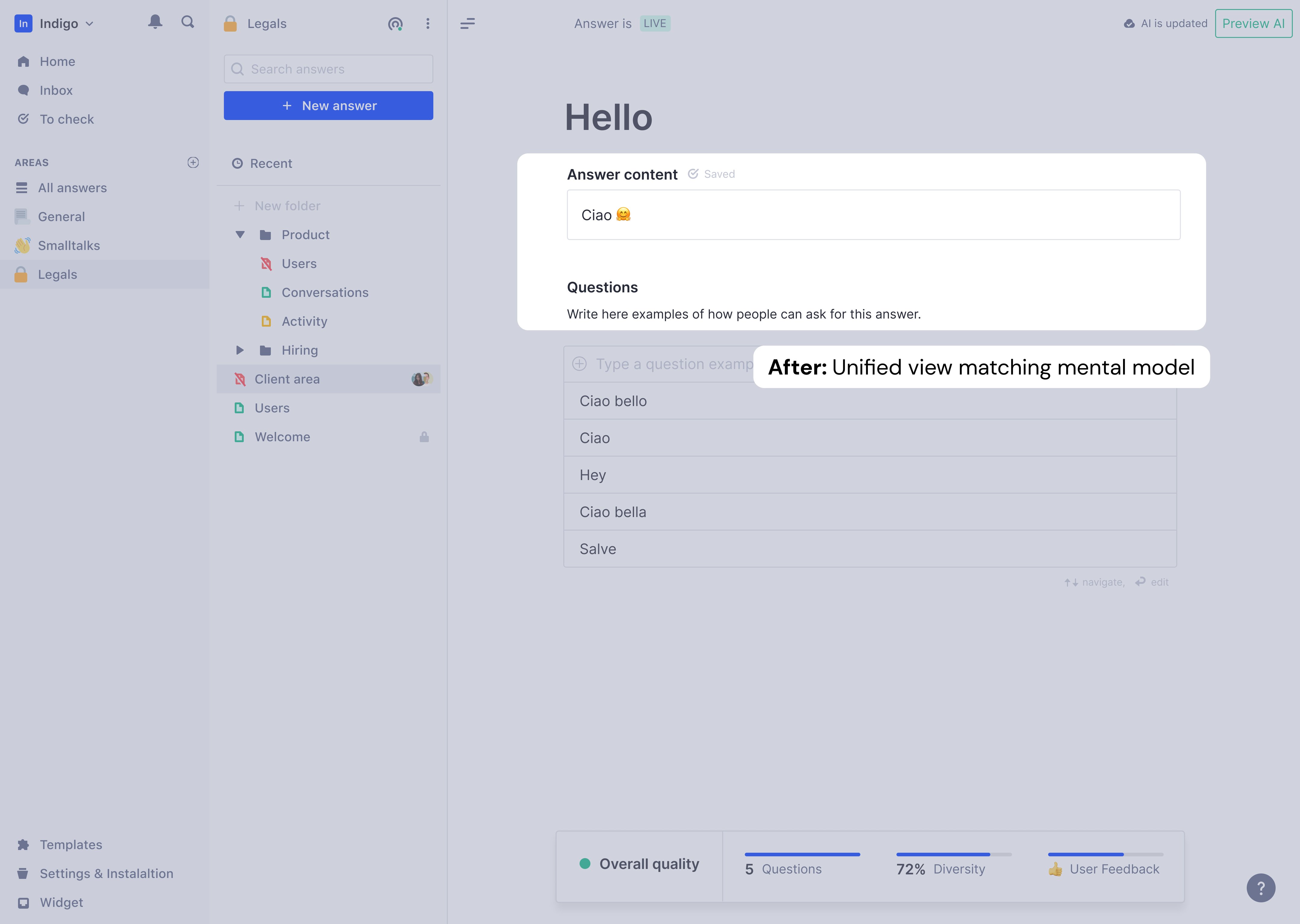 I merged the tabs into a single view: answer at top, questions directly below. Users wrote a question, saw it connect to an answer, added variations, and immediately understood how the assistant would behave. Mental model finally matched interface.