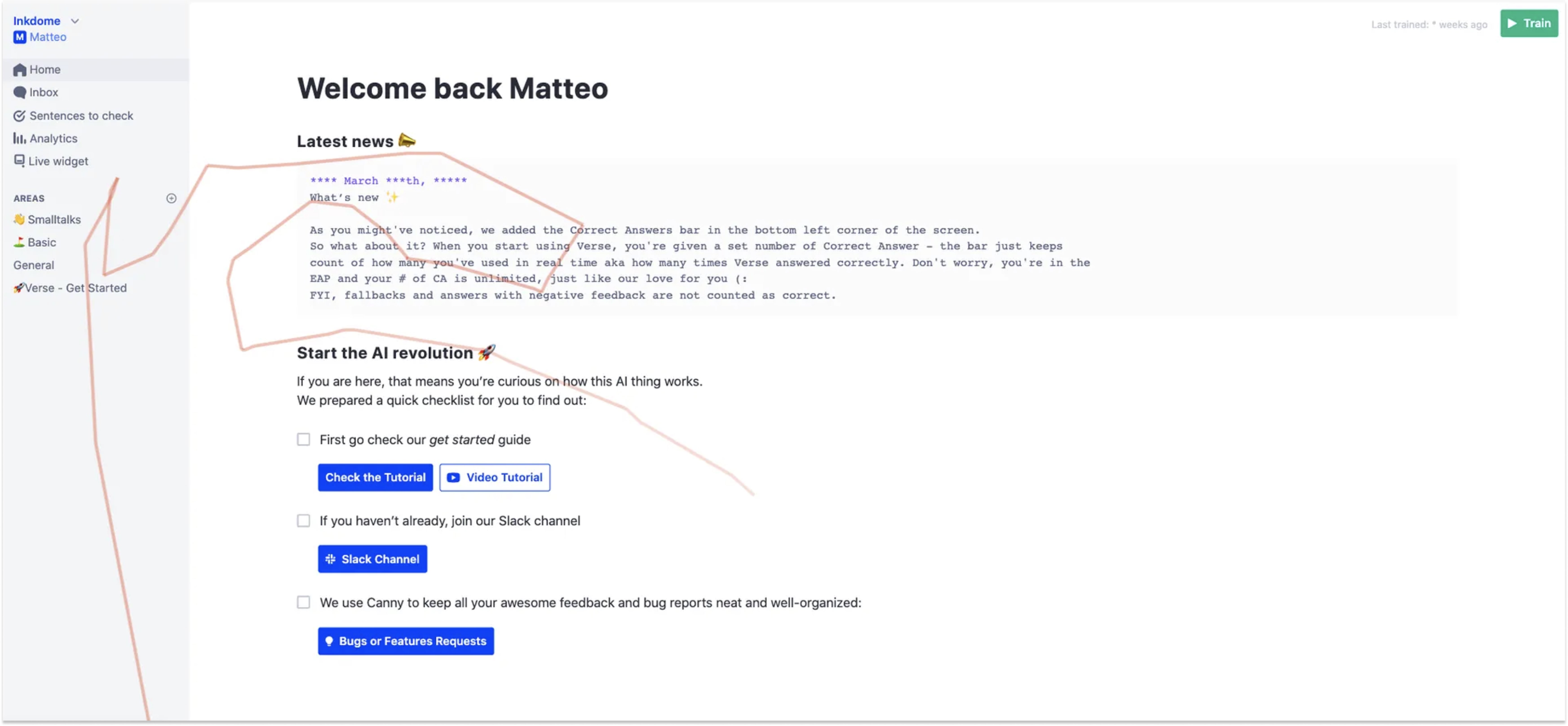 I redesigned the homepage around visible stages: Getting familiar, Create and teach, Install widget. The interface adapted to user maturity—new users saw "Get started," users with 10+ answers saw "Improve KB," users with live assistants saw optimization guidance. Added direct shortcuts to help resources and the internal assistant to reduce context-switching.
