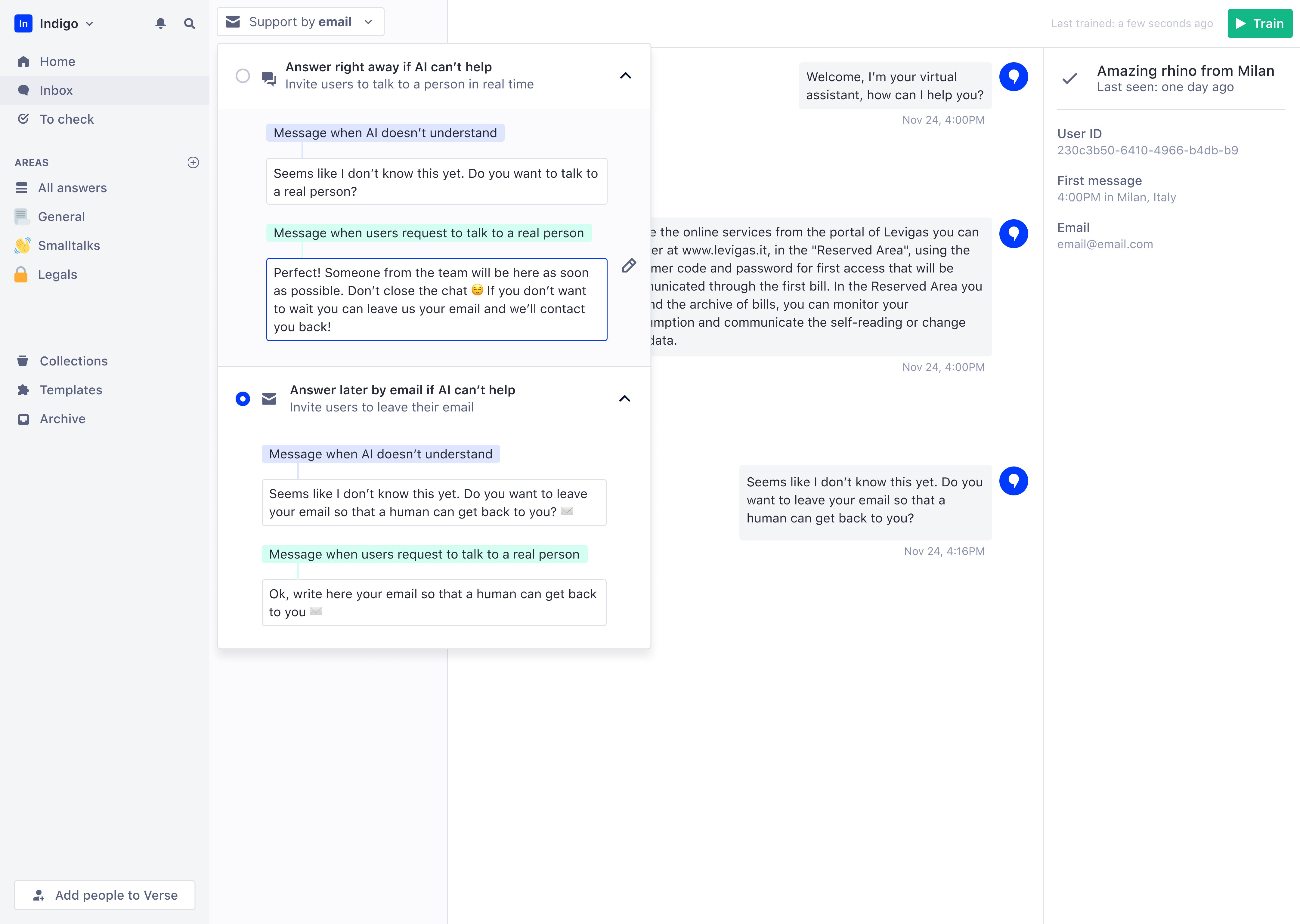 Every AI term was an opportunity to confuse or clarify (""Entity, intent", "Confidence Score", "Train your model") I created Tone & Voice Guidelines and ran a workshop to align the whole team. If conversational AI doesn't start from plain language, the product contradicts its own promise.