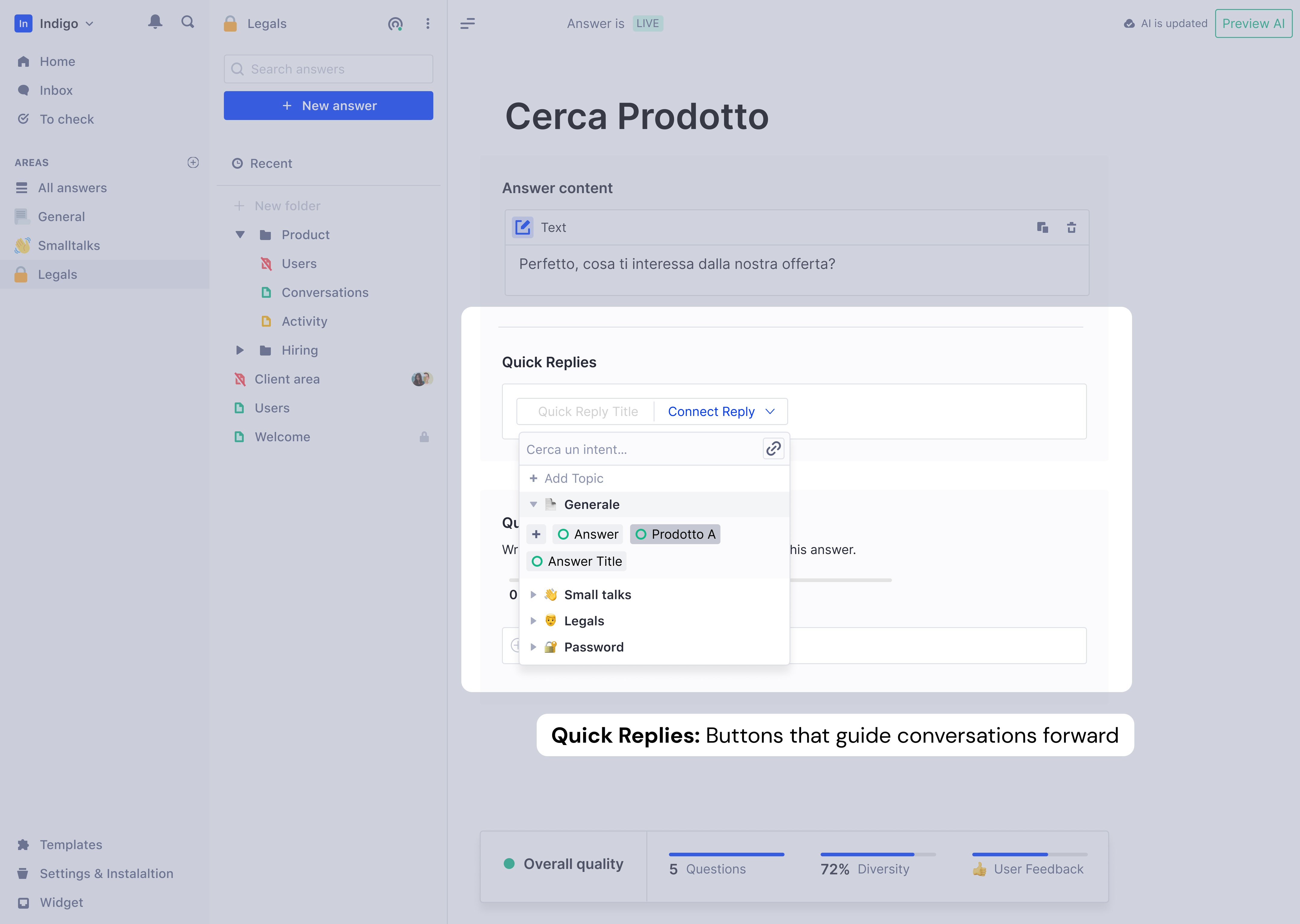 Once the unified tabs proved stable, I expanded what answers could contain: images, documents, location links, and most significantly, Quick Replies—button interactions that guided conversations forward. Quick Replies could navigate to another answer, link to products, or open external URLs.